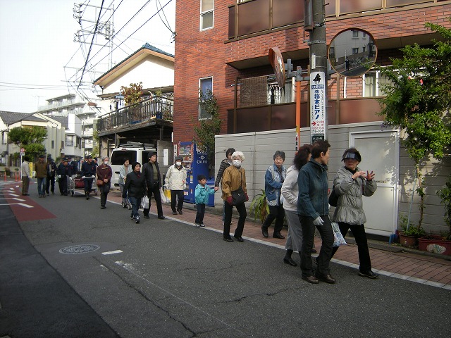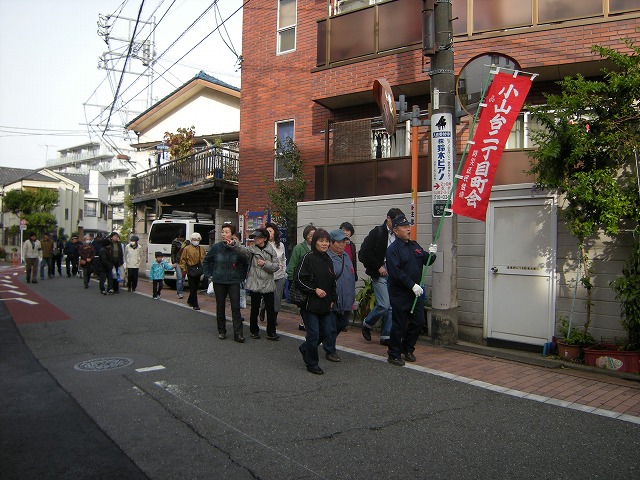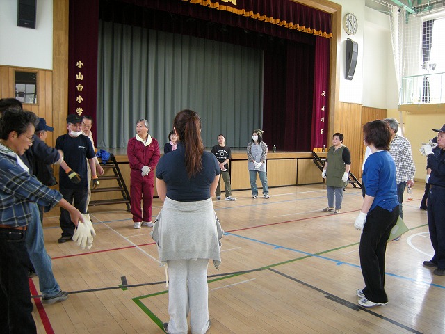 早朝、一時避難場所の小山台公園に総勢40名の町会の方々が集合しました。飯野町会長の挨拶がありました。3月11日の東日本大地震の影響もあり、皆さんの真剣なまなざしが感じとれました。佐藤副町会長を先頭にいざ!小山台小学校へ出発です。