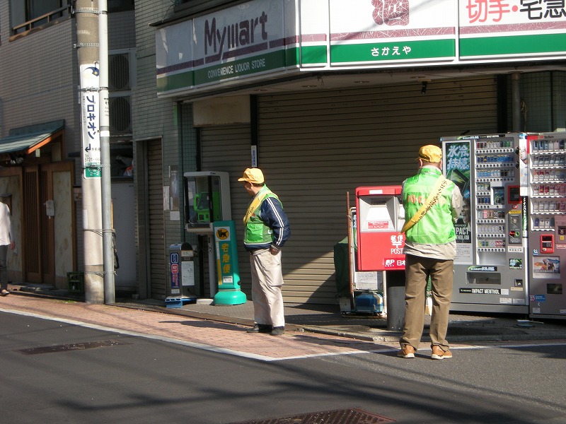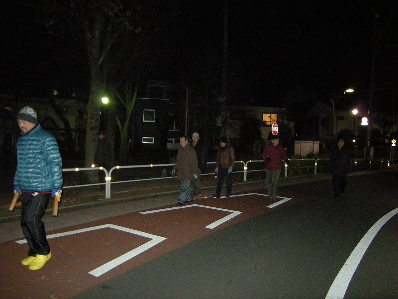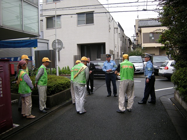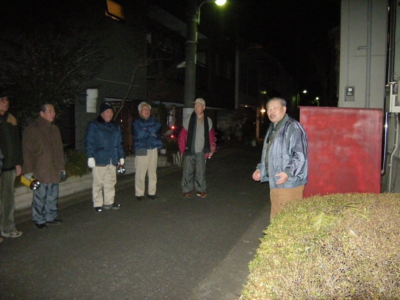 最終日のパトロ-ルです。巡回後本部前にて佐藤副会長のご挨拶があり、向笠防犯部長の三本締め