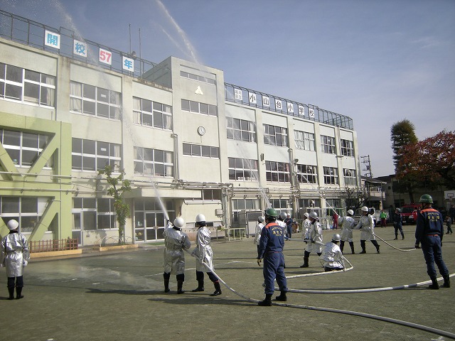 小学校では幹事町会より挨拶。小学校の校長、先生方、品川区の職員の方々、荏原消防署の署員方々、荏原消防団の方々のご協力で開会式が行われ、3班に別れ訓練が始まりました。